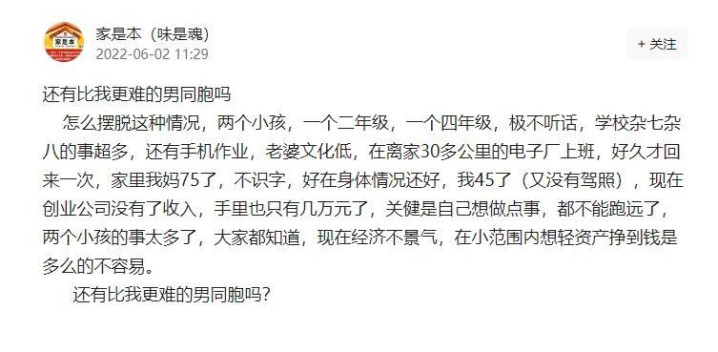 再往前看,是他写的一篇小文:“如何解脱这种情况,两个小孩,极不听话……老婆文化低,在离家30多公里的电子厂上班,好久才转头一次……还有比我更难的男本族吗?”