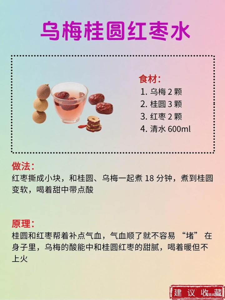 每一款搭配都简便好记,食材常见,煮法融合(乌梅+对应食材+500ml温水,煮10-15分钟,滤出茶汤即可),无须费脑,按需选拔,松驰处置躯壳多样“堵”,还能兼顾护肤、接济减脂~