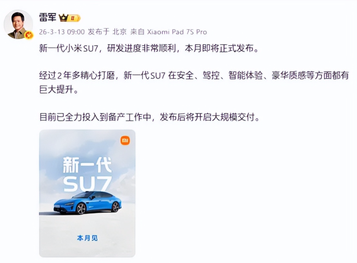 雷军依然厚爱发文,暗示3月将会厚爱发布新一代小米SU7。