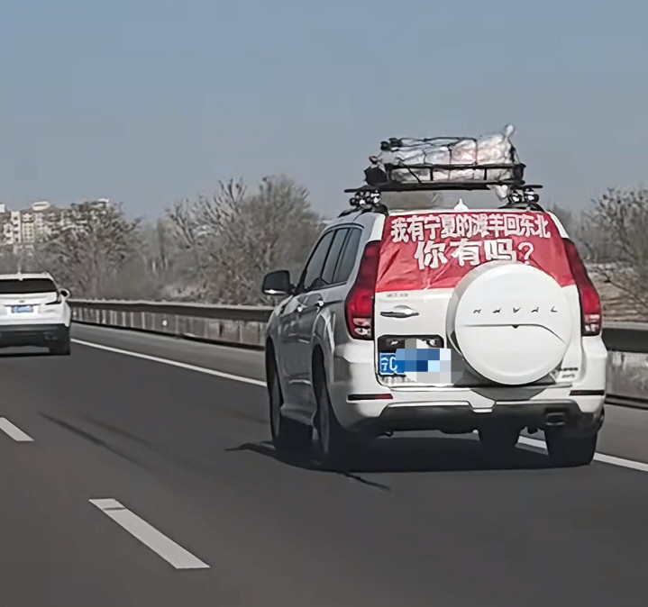2月11日,多名网友发布视频称,在宁夏至黑龙江的公路上,偶遇一辆私家车挂着横幅“我有宁夏的滩羊回东北,你有吗”,车顶还固定放着一整只羊。