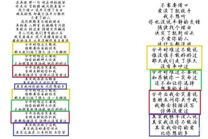 《其实》中的部分歌词被文风不动地照搬,如“分开时痛心不成说”“分开后我会笑着说”等。部分歌词则在原句基础上进行了调动,举例“其实我给你的爱比你思的多”被改为“其实我对你的念比你思的多”。