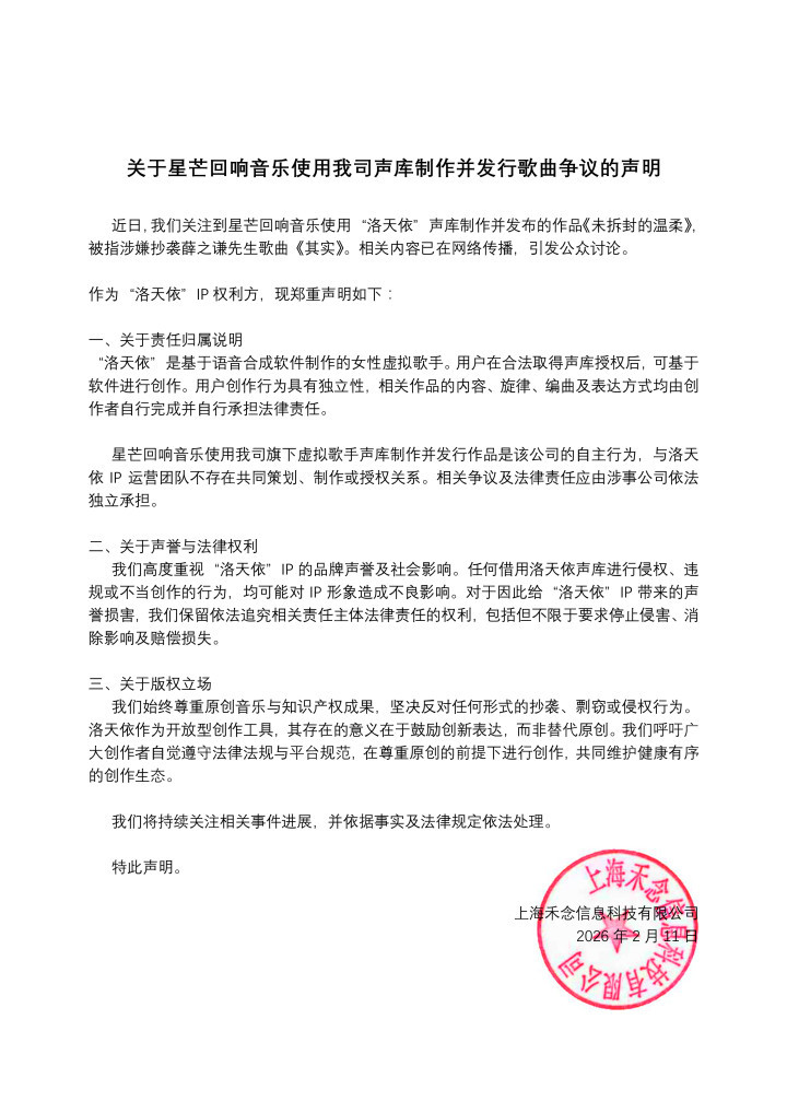 2月11日,“洛天依”IP权益方微博回话称,星芒回响音乐使用我司旗下造谣歌手声库制作并刊行作品是该公司的自主活动,与洛天依IP运营团队不存在共同策动、制作或授权关系。