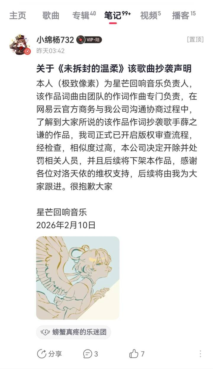 2月10日,星芒回响音乐负责东说念主发布声明称,该作品词曲由团队的作词作曲成心负责,了解到群众所说的该作品作词抄袭歌手薛之谦的作品,我司已隆重开启版权审查经过,经查验,通常渡过高,本公司决定开除并处理联系东说念主员,而且后续将下架本作品,感谢诸位对洛天依的维权因循。