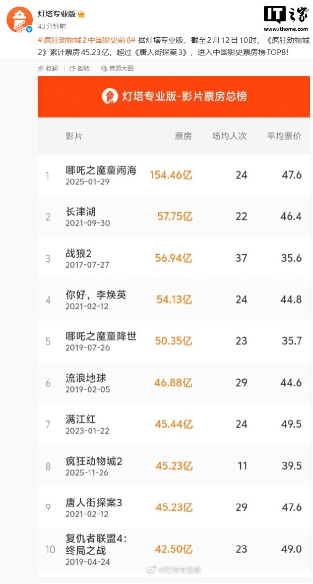IT之家2月12日音讯,据灯塔专科版,收尾2月12日10时开云sports,《跋扈动物城2》累计票房45.23亿,提高《唐东谈主街探案3》,投入中国影史票房榜TOP8。