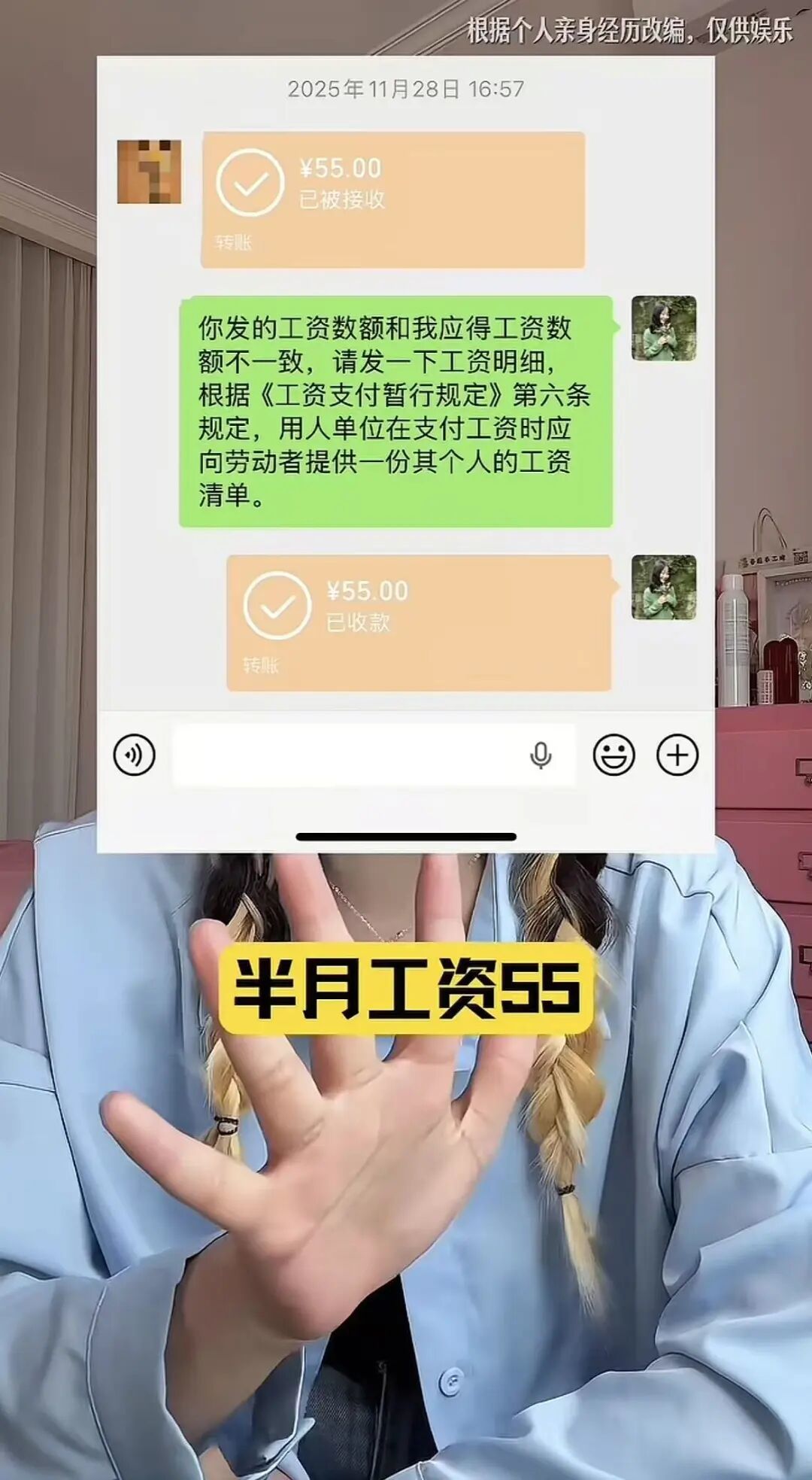 再说说“工资55”。如若这不是刻意修辞,而是实在的薪酬,那也曾不是办事纠纷的问题,而是赤裸裸的欺侮。
