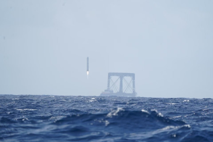 (长征10号一级箭体降落在预定海域,距离“领航者”号网系回收平台船不远)