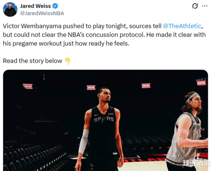 赛前马刺官方晓谕文班亚马因触发脑泛动保护条约缺席本场比赛。