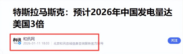 和讯网2026-01-11《特斯拉马斯克:展望2026年中国发电量达好意思国3倍》