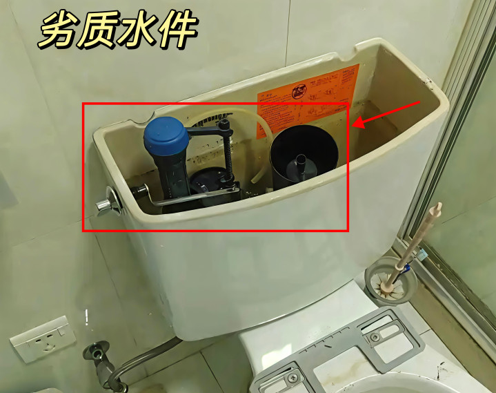 不要选∶劣质水件,结构不紧凑,按键回弹差、卡顿,密封差易老化,水箱不断上水、漏水、跑水,使用寿命短。