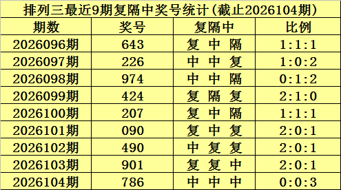 上期回想:成列三第2026104期奖号为:786。大小比为3:0,奇偶比为1:2,012路比为1:1:1。