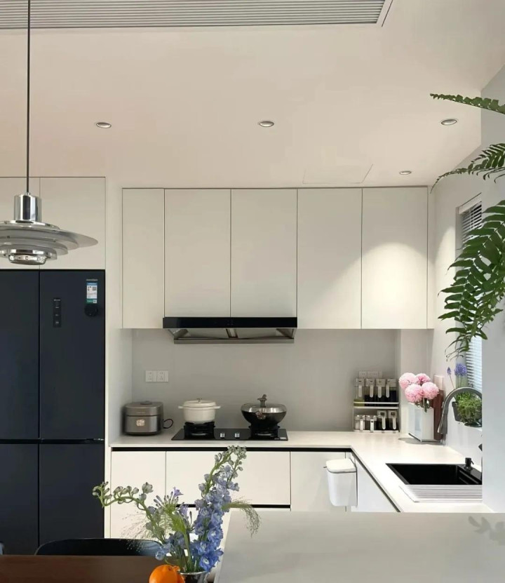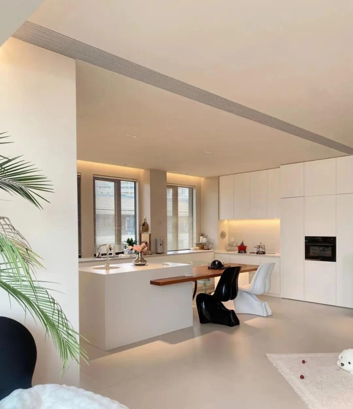 这里不得不不承认,用石膏板吊厨房顶,是真的更显节约大气,尤其是作念开放式厨房,吊顶从餐厅一直延长畴昔,真的很顺眼。