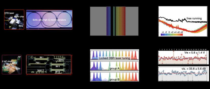 图2集成光量子芯片要道性能表征。a,就业器端氮化硅微腔光频梳种子激光光源芯片。b,暗脉冲光频梳光谱。c,光频梳各梳齿的频率噪声功率谱密度。d,全集成的磷化铟QKD用户发送端芯片。e,用户端腹地片上激光器的波长调谐范围。f,用户端片上调制器半波电压与调制深度。