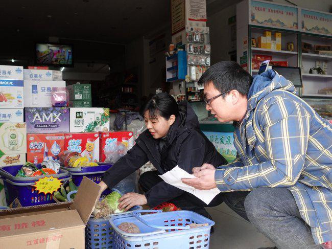 图为志愿者匡助零卖户整理农产物、更新库存 李念念/图
