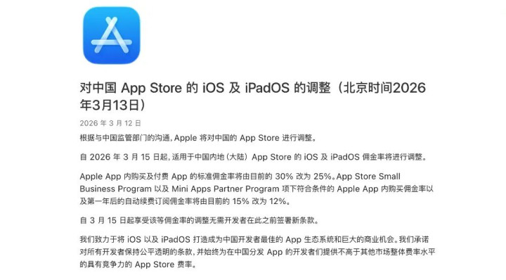 自 2026 年 3 月 15 日起,适用于中国内地(大陆) App Store 的 iOS 及 iPadOS 佣金率将进行退换。