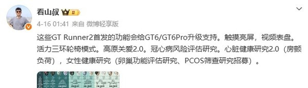 在健康功能场合,爆料中说起的“房颤负荷”等缠绵与推敲技俩,若后续在GT6系列落地kaiyun sports,意味着部分Runner2的健康推敲才调有望扩张到GT家具线。