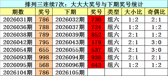 上期回来:罗列三2026104期奖号为:786。类型:组六,奇偶:奇偶偶,大小:大大大。